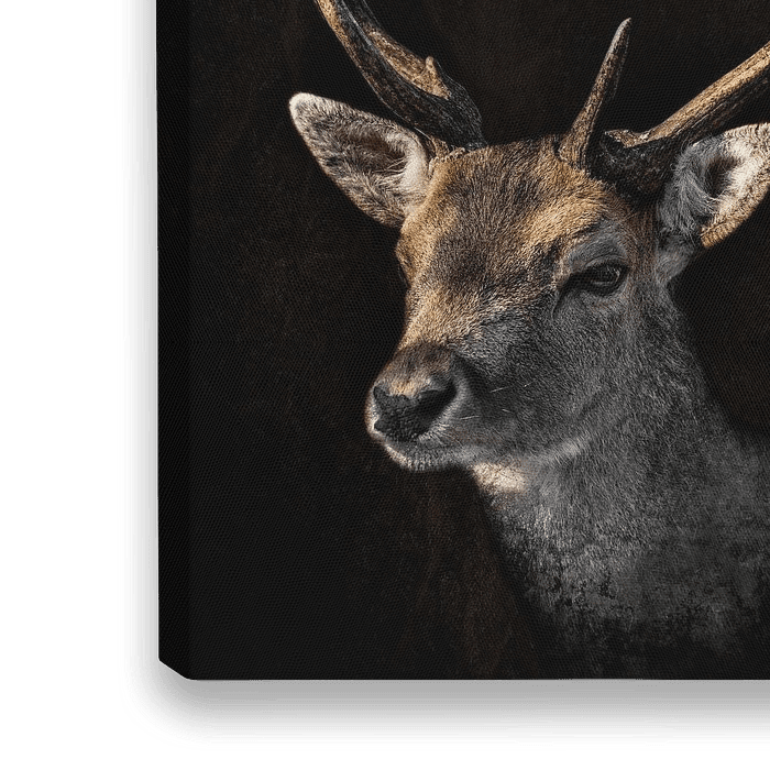 Hert portret met donkere achtergrond en groot gewei als schilderij past in elk huis en elke kamer. Het is veelzijdig en uniek en daarom een mooie toevoeging voor aan de muur.