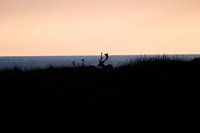 Damherten op de duintoppen in de duinen van Noordwijk bij zonsondergang. Geluksmomentje en alle attentie van de koppies. Prachtig dat ze alle vier een vol en groot gewei dragen.