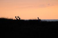 Damherten op de duintoppen in de duinen van Noordwijk bij zonsondergang. Geluksmomentje en alle attentie van de koppies. Prachtig dat ze alle vier een vol en groot gewei dragen.