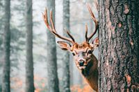 Midden in het mistige bos flitst een majestueus gewei tussen de bomen vandaan. Een hert tuurt nieuwsgierig rond de boomschors, zijn ogen stralen van onschuld en gratie. De zachte beweging van de takken en de mysterieuze sfeer geven de scène een bijna magische kwaliteit, alsof de natuur zelf een geheim moment deelt.