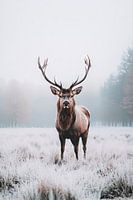 Een prachtig hert met een imposant, vertakt gewei rijst majestueus op in een zacht mistig winterlandschap. Zijn natte, glinsterende ogen stralen vastberadenheid uit, terwijl de ijzige grond kraakt onder zijn hoeven. Omringd door een magische witte deken van vorst ziet hij eruit als een koning die zijn koninkrijk bewaakt.
