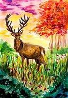 een traditioneel aquarelkunstwerk van een hert met een krachtig gewei op een open plek in een kleurrijk herfstbos.