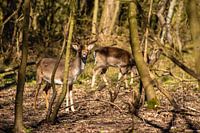 grazende herten in het bos met de eerste zonnestralen van de aankomende lente