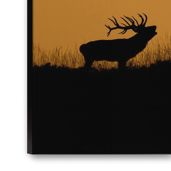 Een burlend edelhert tijdens de hertenbronst met zijn hindes. De foto is genomen tijdens de zonsondergang.
