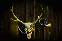 Oud herten gewei en twee Duitse jachthoorns .