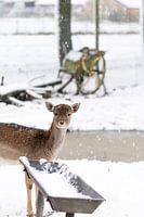 Op een stille winterochtend is dit beeld vastgelegd. De lucht hing vol zachte sneeuwvlokken en de wereld was bedekt met een frisse, witte laag. Net op dat moment liep dit jonge hert het beeld in, recht naar de kruiwagen die daar al ondergesneeuwd stond.