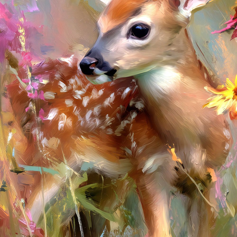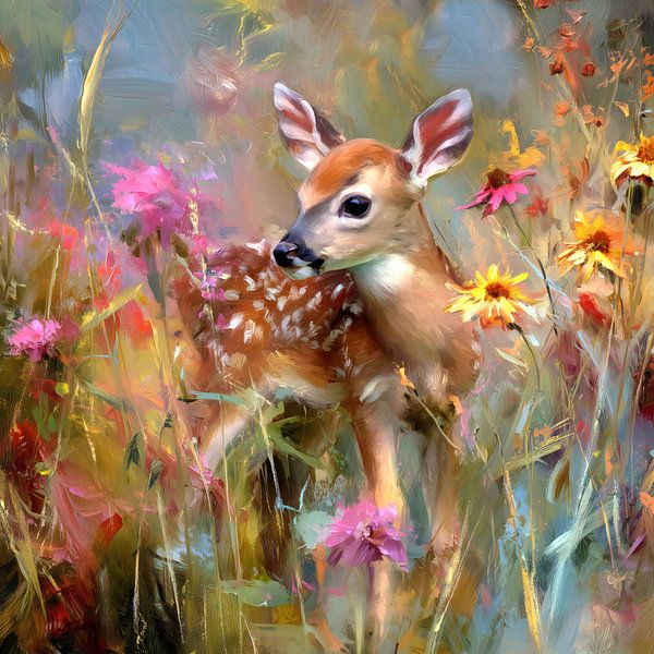 Impressionistisch portret van een jong hertje tussen de wilde bloemen
