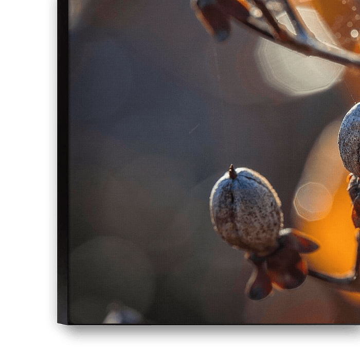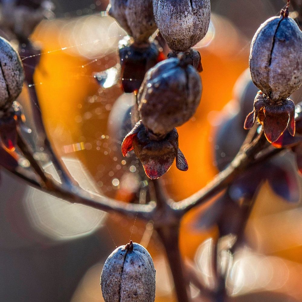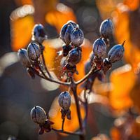 Close-up van een uitgebloeide Hertshooi met op de achtergrond tegenlicht wat door de bladeren valt.