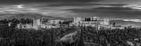 Stadspanorama in zwart-wit.
