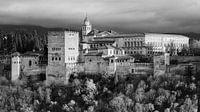 Een zwart-wit foto van het Alhambra, een paleis gelegen in de stad Granada, in de regio Andalusië in het zuiden van Spanje. Het Alhambra is een van de beroemdste monumenten van de islamitische architectuur en een van de best bewaarde paleizen van de historische islamitische wereld, naast opmerkelijke voorbeelden van Spaanse renaissance-architectuur. Foto is gemaakt vanaf het beroemde uitzicht Mirador de San Nicolas.