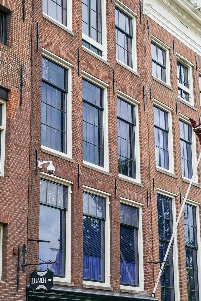 Voorkant van het Anne Frank huis aan de Prinsengracht in Amsterdam. met enkele toeristen die passeren.