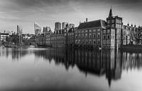Het Binnenhof voor de Haagse skyline, vlak water op de Hofvijver op een zomerdag laten een rustig beeld zien van het Nederlandse politieke hart.