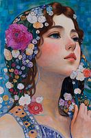"Het Bloemenportret van de Jonge Muze" betovert de kijker met een weelderige compositie die geïnspireerd is door de iconische stijl van Gustav Klimt. In dit kunstwerk staat een jonge vrouw centraal, haar elegante gelaat omgeven door een zee van levendige, met de hand geschilderde bloemen die zich als een kroon van leven om haar hoofd…
