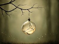 Fragiele glazen bol met een haarlijnscheur, hangend aan een kale tak boven laag gras; binnen in de bol een warm, spaarzaam licht tegen een mistige, gedempte bosachtergrond — sfeervolle, stille fine art print.