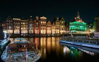 Laat op de avond gefotografeerd: Het Damrak te Amsterdam.