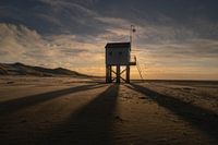 Zonsondergang bij het drenkenlingenhuisje zorgt voor een mooie schaduw op het zand