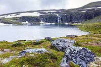 Het ruigen Noorse landschap bij het meer Flotvatnet, POI langs de 48 kilometer lange sneeuwweg of Snøvegen van Lærdalsøyri naar Aurlandsvangen. Ruige natuur van de Noorse hoogvlakte nabij het Nationale park Jotunheimen. Deze foto is gemaakt in Augustus 2017