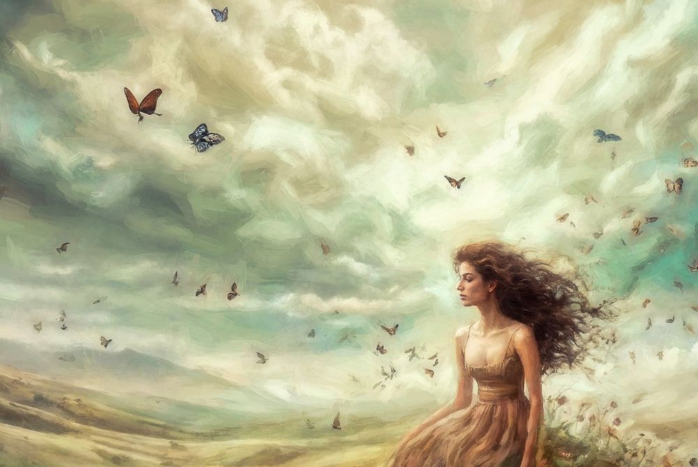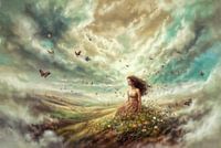 "Het Fluisteren van Gaia" is een betoverend kunstwerk dat de essentie van Moeder Natuur in al haar glorie vastlegt. De compositie toont een jonge vrouw, symbool staand voor Gaia, de personificatie van de aarde, zittend op een bloemrijke heuvel terwijl zij de vredige wildernis overziet. Om haar heen fladderen vlinders, die de lichtheid en de delicate interactie met haar natuurlijke omgeving symboliseren.