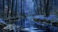 Mystieke bosrivier in schemerblauw met paarse bluebells en zilveren reflecties, droomachtige fine art print