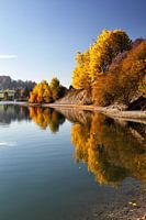 Herfstlandschap weerspiegeld in de Forggensee in Allgäu, Beieren, Duitsland.