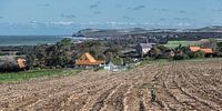 Het Noord-Franse landschap met links het kanaal bij het dorpje Tardinghe net na de maisoogst waarvan de resten nog in lijnen zichtbaar zijn en de kaap "De Witte Neus" (cap Nez Blanc) op de achtergrond.