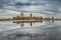 Zicht op het Friese dorpje Jorwerd, beroemd geworden door Geert Mak, gespiegeld in een plas na ee regenbui, en met een stevige wolkenlucht.