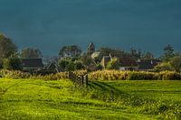 Het Friese dorpje Raard met de kerktoren erbovenuit stekend in de herfstzon met een zware lucht op de achtergrond
