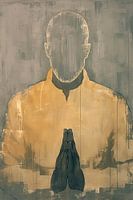 Het Gebed - Dit abstracte schilderij toont een anonieme figuur zonder gezicht, gekleed in een roestbruine jas, tegen een achtergrond van ijskoude grijze en textuurrijke oppervlakken, met prominent in het midden een paar samengevoegde donkere handen in een houding die reflectie of aanbidding suggereert.