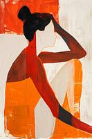 De armen zijn zorgvuldig geplaatst, met één hand rustend op haar hoofd, wat een gevoel van contemplatie of emotionele spanning overbrengt. De kleurcompositie speelt met warme oranje- en roodtinten die de figuur omhullen en een levendige energie oproepen, terwijl de neutrale achtergrond deze intensiteit in balans houdt. De lijnen zijn vloeiend en minimalistisch, wat de focus legt op de expressie en houding van de vrouw. De mix van abstractie en realisme zorgt ervoor dat het werk open staat voor interpretatie en emoties oproept zoals reflectie, kracht en kwetsbaarheid.