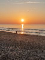 Deze adembenemende fine art fotografie, vastgelegd in Wijk aan Zee, toont een serene zonsondergang boven de rustige zee. De zon hangt laag aan de horizon, werpt een prachtige gouden gloed over het water en creëert een betoverende reflectie op het oppervlak. Op de voorgrond is een eenzame wandelaar te zien die langs het strand loopt en een gevoel van vrede en verbondenheid met de natuur oproept.