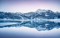 Het meer van Gramolazzo en sneeuw in de Apuaanse bergen in de winter bij zonsondergang. Garfagnana, Toscane, Italië, Europa. Fotografie met lange belichting.