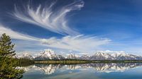 Een 16:9 foto van een weids uitzicht op de besneeuwde toppen van het Grand Teton gebergte in Grand Teton National Park die weerspiegeld worden in Jackson Lake in het noordwesten van Wyoming, Verenigde Staten.