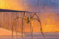 De grote Spin voor het beroemde Guggenheim Museum in de Spaanse stad Bilbao met zijn aparte vormen en zilver en goudkleurige glimmende buitenkant tijdens een zonsondergang op een zomeravond.