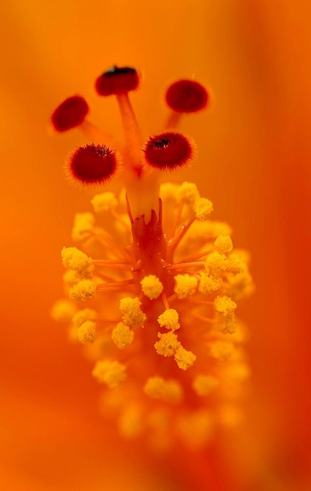 Deze macrofoto toont het hart van een oranje hibiscusbloem, waarin de structuren van de meeldraden en stamper centraal staan en haarscherp in beeld zijn gebracht. Dit zorgt voor een abstract geheel.