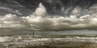 Nog voor de aanleg van de nieuwe jachthaven in Cadzand, deze foto gemaakt van de oude situatie. Stevige wind en branding over de golfbreker, fraai wolkenpatroon, daarom een weidse, brede weergave.