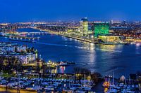 Het IJ Amsterdam bij avond. Gefotografeerd vanaf de oude Shelltoren, nu Look Out, aan de noordoever, richting het oosten. Amsterdam Oost. In de voorgrond de jachthaven en de pont. Verder oa.het Bimhuis en de Passengers Terminal
