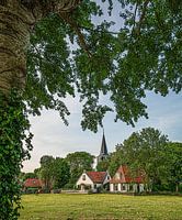 Het Friese IJsselmeerstadje Makkum heeft vlak langs de rand van de IJsselmeerdijk een herkenbaar stukje met zicht op de kerktoren en twee authentieke witte huisjes met rode dakpannen.