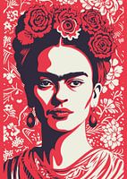 Dit kunstwerk in een linodruk stijl van Frida, is een eerbetoon aan de iconische Mexicaanse kunstenares. De afbeelding toont Kahlo's onmiskenbare gezicht, omlijst door haar kenmerkende bloemenkroon. De kleuren van het werk zijn rood en diep zwart, wat een krachtig en dramatisch effect creëert.