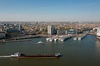 Amsterdam The Netherlands Elevated view of the city seen from Adam Lookout observation deck. River boat cruise ships moored along Het Ij, Port of Amsterdam Building, Kamer van Koophandel (Chamber of Commerce.) An empty bulk cargo vessel passes.