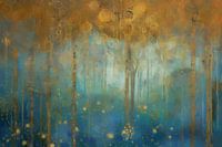 Dit werk toont een boslandschap in de herfst, waarbij de bomen baden in een warme gouden gloed. De bomen lijken te verdwijnen in de achtergrond, terwijl het licht door de takken en bladeren sijpelt. De kleuren variëren van diep blauwgroen aan de onderkant tot warme oranje en gouden tinten aan de bovenkant. De zachte overgangen tussen de kleuren en de delicate lichtvlekken geven het werk een dromerige, serene sfeer. De stijl en compositie doen denken aan de Jugendstil, met invloeden van Gustav Klimt zichtbaar in de decoratieve patronen en de rijke kleurtoepassing. Dit werk brengt een gevoel van rust en warmte, perfect voor een interieur dat een vleugje natuur en elegantie wil toevoegen.