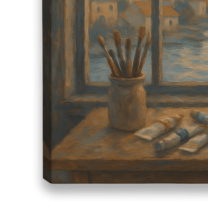 Op het houten werkblad liggen penselen, verf en een onaf doek: een momentopname van creatie zelf. Het schilderij vertelt niet alleen over wat buiten zichtbaar is, maar ook over wat zich binnenin de kunstenaar afspeelt. Het is een ode aan de rust van het ambacht, aan het kijken, voelen en vastleggen van licht.