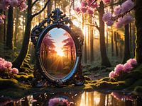 Stap in een wereld vol verwondering met "Het Lichtportaal", een adembenemend kunstwerk dat fantasie en natuur samenbrengt. In een met zonlicht doordrenkt bos staat een rijkversierde spiegel met een donker houten frame, ingelegd met kleurrijke glasfragmenten in warme tinten van rood, roze, oranje en blauw. De spiegel lijkt een magisch…
