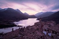Klein Italiaans dorp met meer en bergen, zonsondergang, schemer, Italië, berg, stad