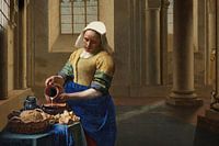 Het iconische Melkmeisje van Vermeer staat dit keer in een imposante kerk vol licht en stilte. Een unieke bewerking waarin huiselijkheid en spiritualiteit samenkomen in één kunstwerk. Ideaal voor wie houdt van klassieke schilderkunst met een poëtische twist.