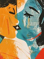 Intieme, bijna abstracte weergave van twee gezichten die dicht bij elkaar zijn, vermoedelijk op het punt van een kus. De compositie maakt gebruik van felle, contrasterende kleuren zoals oranje, blauw en zwart, waardoor een dynamisch en levendig beeld ontstaat. De gezichten zijn gestileerd met eenvoudige lijnen en vormen, waarbij de expressieve ogen en lippen de aandacht trekken.