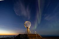 Hoe bijzonder om te zien het noorderlicht op het uiterste puntje van Europa. Het dansende poollicht boven het monument van de Noordkaap in Noorwegen.