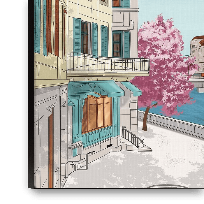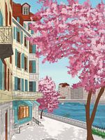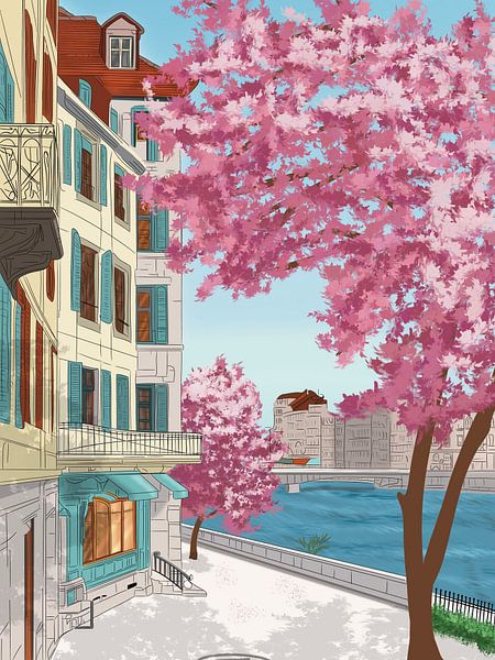 Stel je een ochtend voor aan de oevers van de Rhône, waar de frisse Alpenlucht zich mengt met de eerste warme zonnestralen van het jaar. Dit kunstwerk, getiteld "L’Éveil de Genève", legt dat exacte moment van transformatie vast. De stad schudt de winter van zich af en explodeert in een zachte wolk van roze bloesems die fel afsteken…