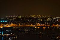 Links op de voorgrond in beeld technisch museum Nemo, daarnaast de Prins Hendrikkade, links in de verte de RAI en recht in de verte de Zuidas.