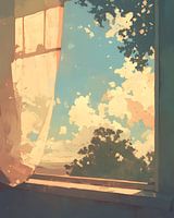 In dit kunstwerk wordt een open raam tot leven gebracht in een mix van warme kleuren en tinten, die prachtig samensmelten en een zomerse sfeer oproepen.
