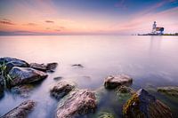 Het "Paard van Marken" is wellicht het meest gefotografeerde gebouw van Nederland. Bij een magische zonsopkomst toont deze vuurtoren zich in al zijn schoonheid. Deze dag was dat met sluierbewolking en fraaie zachte tinten. Het was vrijwel windstil dus het rustige water zorgt samen met de zachte pastel kleuren voor een sereen plaatje.
